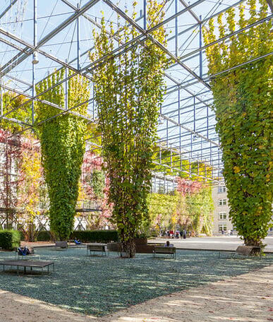 Die Bepflanzung im MFO-Park in Zürich-Oerlikon zeichnet die Konturen der ehemaligen Fabrikhallen nach.