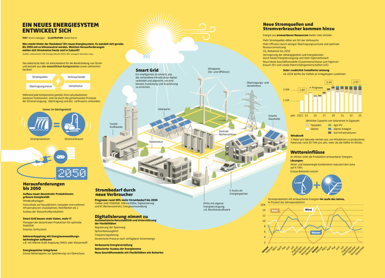 Ein intelligentes Stromnetz, das die vorhandene Infrastruktur digital verbindet und abgleicht, um eine bessere Auslastung und Ausnützung zu erreichen.